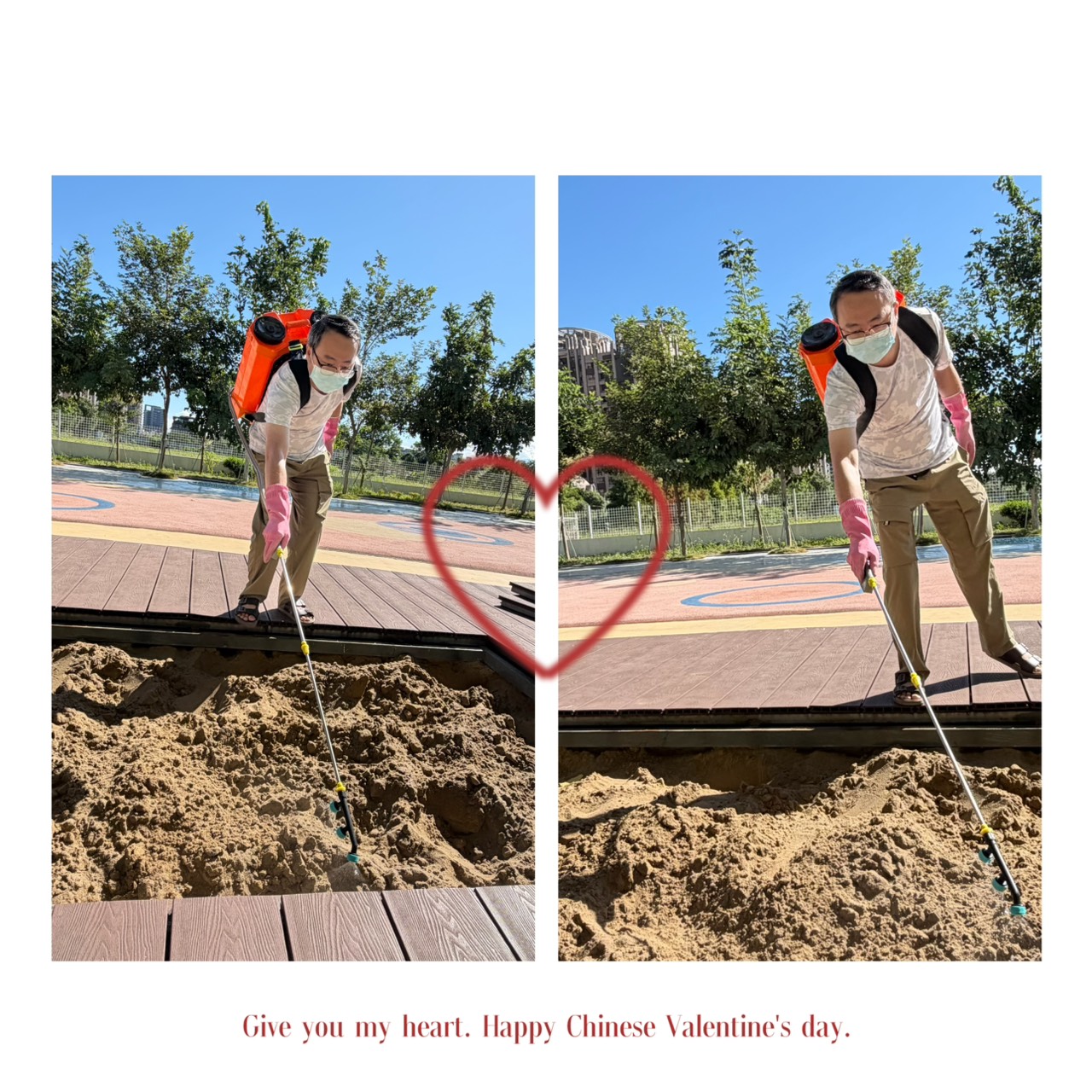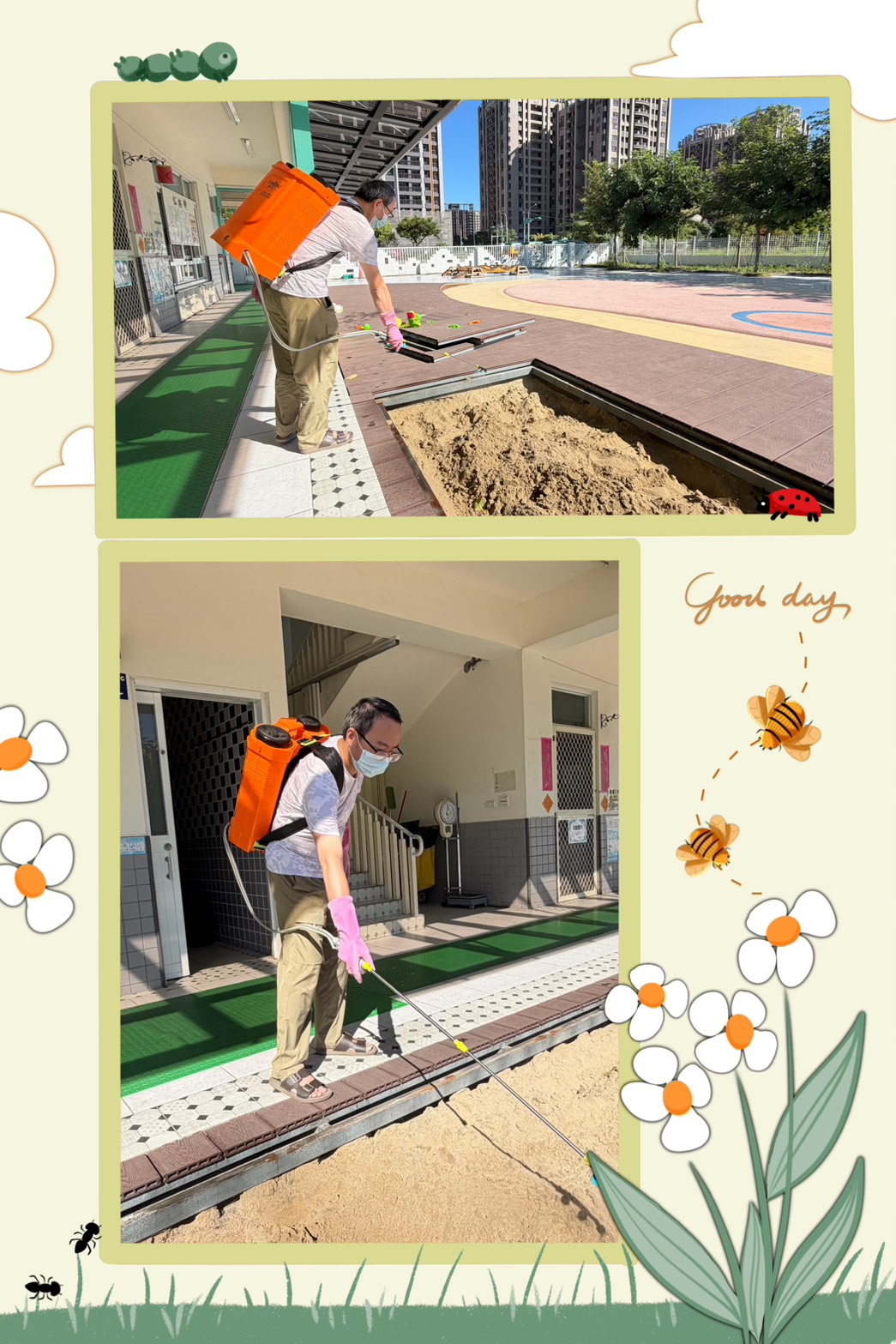 利用假日時間,本園特地邀請消毒人員到校園進行沙坑及水溝的消毒動作,沙坑的每個角落和水溝的每個洞口都不放過,乾淨安全的環境是我們應該給孩子的保障,這麼熱的天氣也要特別謝謝消毒人員的用心,真的要給他大大的讚^^